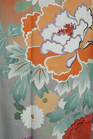 上前に大きく描かれた牡丹の花弁にはふっくらとした手刺繍が。