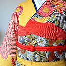 ふっくらとした縮緬地に、紅型を代表する黄色をベースに赤、黒、緑、青…と多色な彩色で晴れやかな生き生きとした印象。