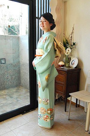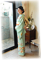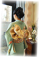 お選びいただいたのは、青みがかった緑色の訪問着。