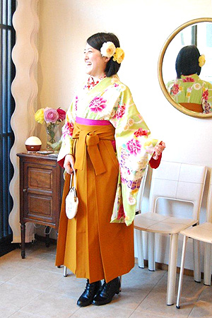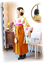 明るい色彩同士を合わせて、お洒落で可愛い袴姿の完成!
