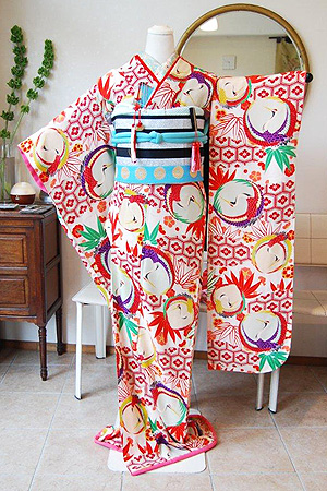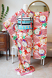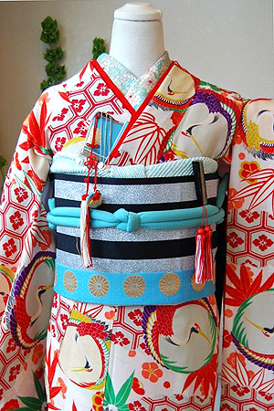 吉祥文様である亀甲柄、竹梅が全体に染められ、とても華やか。
