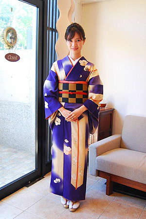 スラリとした縦長の文様とのバランスを考え、帯も高めの位置をキープした飾り結びに。