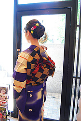 黒と鈍いゴールドの市松文様の袋帯を合わせて、モダンなコーディネートに。