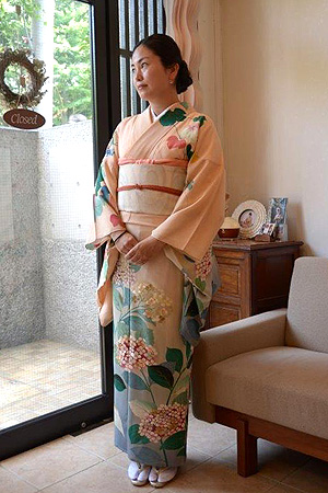着物の柄がポンと目に飛び込んできて、まるで大きな紫陽花の花束を一抱え纏ってらっしゃるように見えませんか?