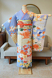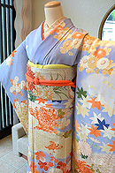 菊に紅葉雲取り吉祥文様振袖澄み渡る空のような爽やかな水色地の振袖が入荷しました!