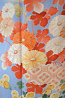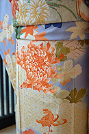 くっきりとした友禅染が晴れ着に相応しく、手刺繍を施された菊花文様が浮き立つような立体感を出しています。