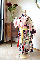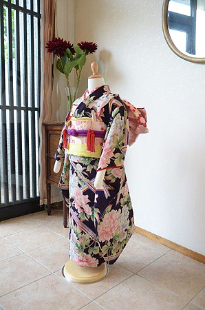 少し紫がかった黒地に、大輪の牡丹が垣根とともに染められた昭和初期に着物。