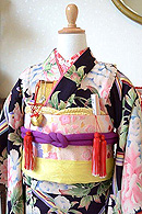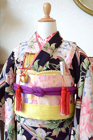 帯揚げや帯締めなどの小物は赤ではなくあえて黄色、紫といった落ち着いた色を選び、少し大人っぽいコーディネートにしてみました。
