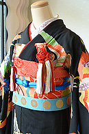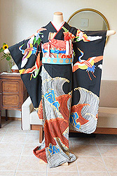 KF16-1 舞鶴に波の図刺繍黒引き振袖 レンタル料金一式160,000円