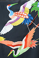 千年生きる鳥とされ吉祥文様として古くから愛される鶴と留まることなく流れ続け清流のような清らかさの象徴とされる波文様が、手描き友禅染と手刺繍で表されています。