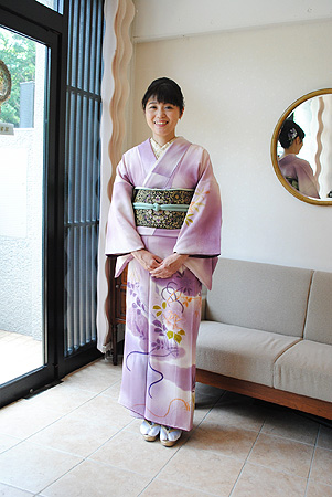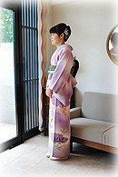 お召いただいたお着物は、淡い紫色のぼかし地に優しく描かれた薔薇の文様の訪問着です。