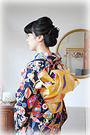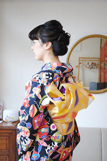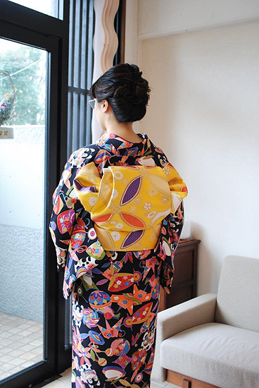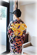 思い切りよく合わせた黄色の袋帯がおしゃれなお客様の魅力を引き出して、とってもお似合いでした。