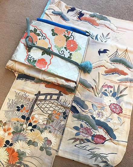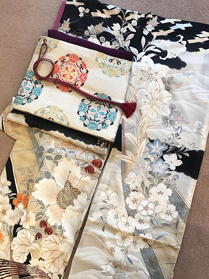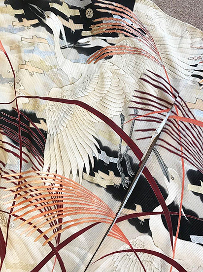 後ろ姿に羽ばたく大きな白鷺がなんとも豪快!大胆で繊細なアンティークらしい一着。