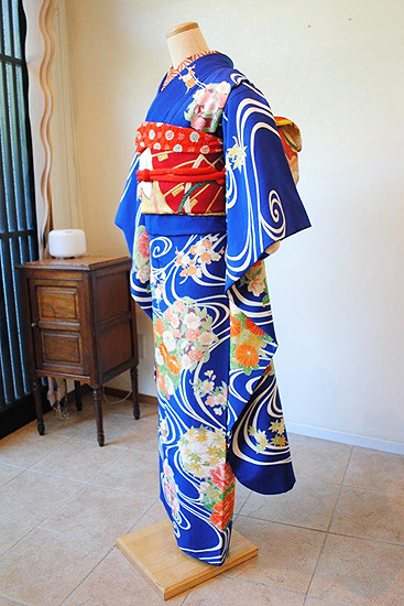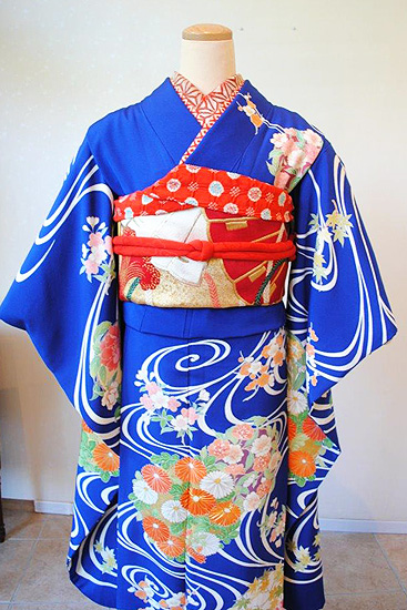 そんな吉祥文様である流水が主役となっており、非常に縁起が良く、対照的な朱赤の花々と相まって目を引く古典的な雰囲気です。