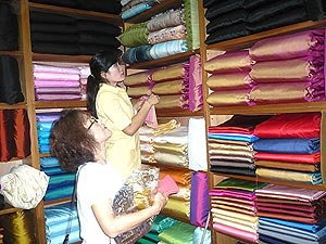 タイシルクのみならず、綿や麻などいろいろな布地を物色。
