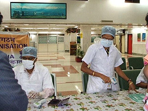 インフルエンザ対策の完全防備の服装で迎えてくれました。入国する人の額に小さなピストルのような物(たぶん体温計)