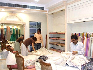 この店にあるサリーは デザイン、布ともに洗練され高品質。