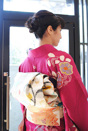 帯はアンティークの丸帯を合わせ、ころんとした表情の変わり太鼓にさせていただきました。