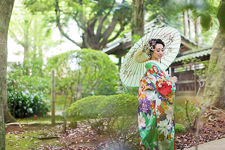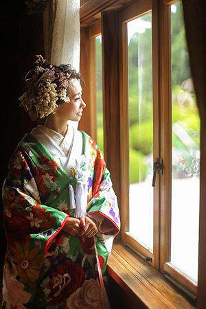 婚礼衣装の色打掛というと、赤やピンクなど派手な色味を思い浮かべますが、こちらは珍しいグリーンの打掛。