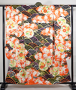 青海波に枝垂れ藤花丸文様綸子振袖 レンタル一式 160,000円+税