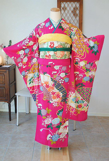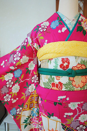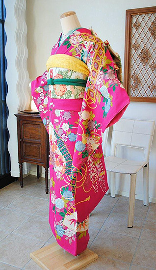 思いきった楽しい色使いが魅力的な振袖ですが、アンティークならではの繊細で上品な雰囲気もしっかりと持ち合わせています。