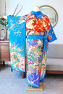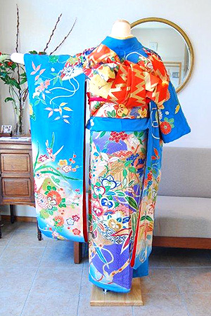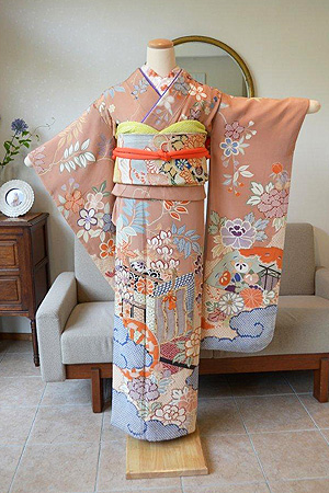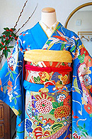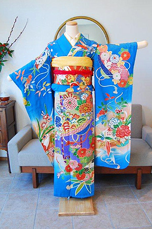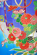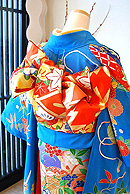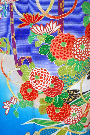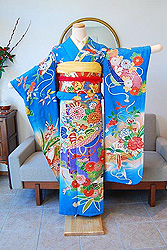 こちらの振袖は鷺や千鳥が舞い、正面には船の上に大きな芙蓉、撫子、萩やススキなどの秋草の花籠が大胆に描かれた、秋のお祝いの席にぴったりの一着です。