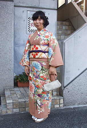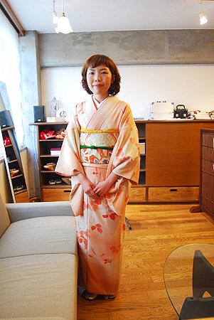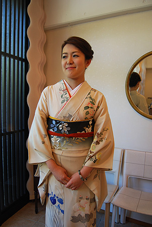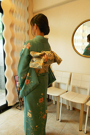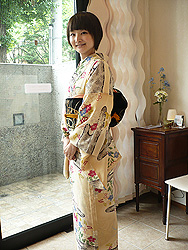 今回は、淡いベージュの地に、水墨画のようなタッチで四季の花々が描かれている単衣の着物をお選びになりました。