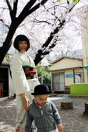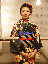 渋い地色の着物に黒い帯という甘さ控えめのコーディネートが、お顔立ちの可愛らしさを一層ひきたてているようです。