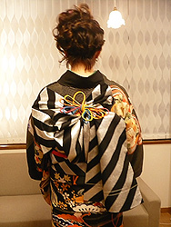 今回は同僚の方の式へのご参列でしたが、パーティーなので比較的自由で遊び心のあるお召物でもOKとのことと、「クリスマスもテーマなんです」とのお客様のご希望から、赤や緑をさし色に個性的なストライプの帯で引き締めた、とくべつ華やかな着物姿にさせていただきました☆