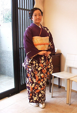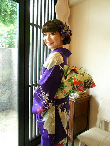 アンティーク好きのお客様は、レトロな丸帯に紫をポイントにしたコーディネートに。