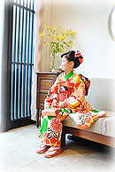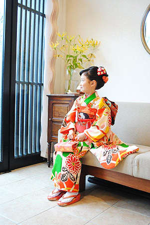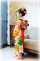 真っ赤な着物に絞りの帯が華やかで、可愛らしく優しい雰囲気のお嬢様にとてもよくお似合いになり、とても素敵でした。