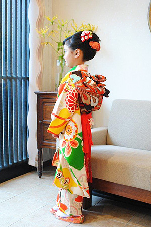 7歳の七五三の際にお嬢様がお選びになられたのは黒地の着物でしたが、お母様はこちらの緑地の着物も気になっていたそう。