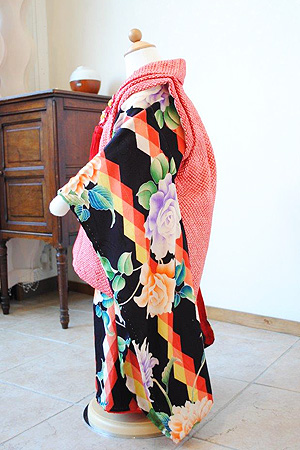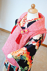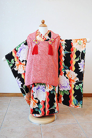 シックな黒地が大人っぽい印象となりますが、赤の絞りの被布を合わせることにより、子供らしさが引き立つ愛らしい装いとなります。
