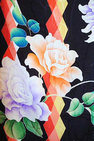 ダイヤが連なった菱文様に薔薇の花が染められた紋錦紗(もんきんしゃ)地の祝い着。