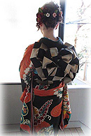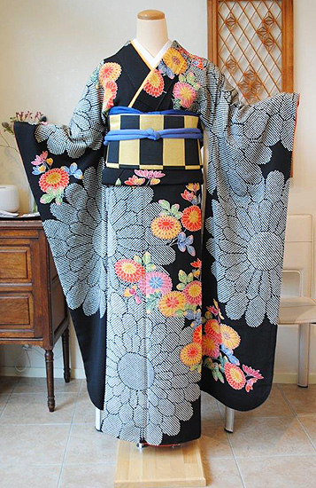 栗山吉三郎作 紅型染め菊花文様黒振袖 レンタル一式 160,000円+税