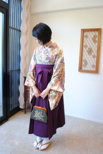 グレーと薄紅色の珍しい配色は、落ち着きがありながら女性らしい可憐さを持ち合わせ、お客様の華やかなお顔立ちを引き立てて本当に良くお似合いでした。