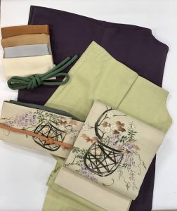 紫縮緬のお着物は、縮緬なのに軽い着心地がおすすめ。写真よりも,明るく柔らかい色合いなので、帯の藤の花が引き立ちます。