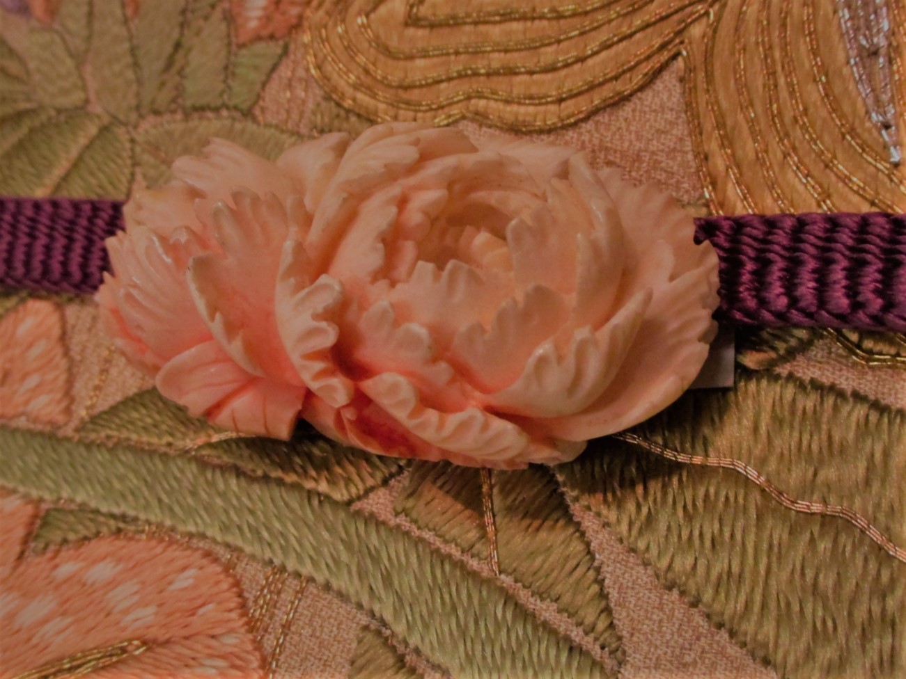 帯留めに象牙の芍薬を添えて、春の装いを楽しんでみませんか。