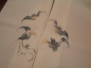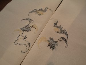 コウモリの半襟 皆様に人気のコウモリの半襟を入荷しました! これから衿元で活躍してくれそうです。 刺し方により変化のある2種類。 お出かけのお供にどうぞお連れください。 コウモリの刺繍半襟 12,000円+税