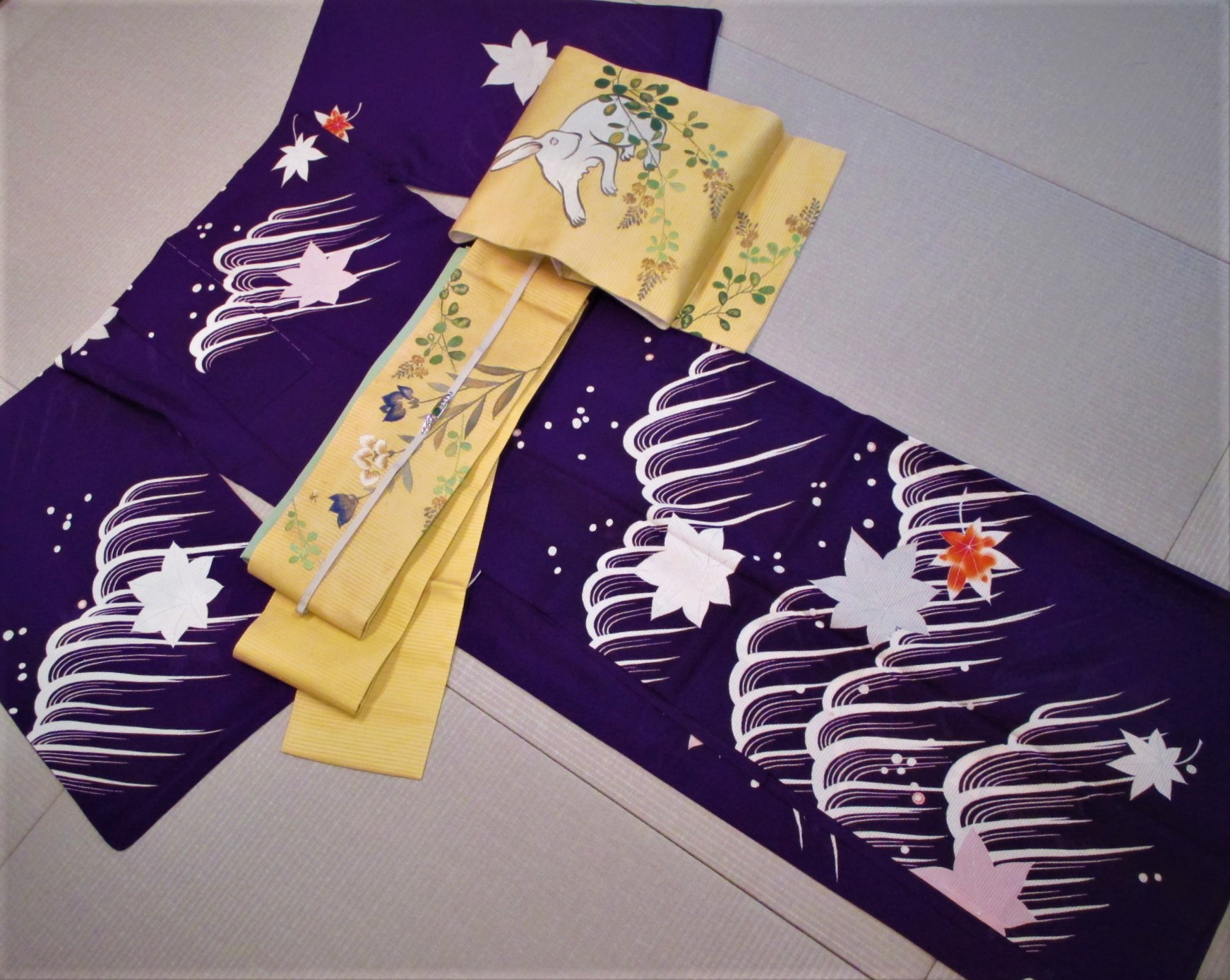 帯は、萩に白兎の刺繍帯です。