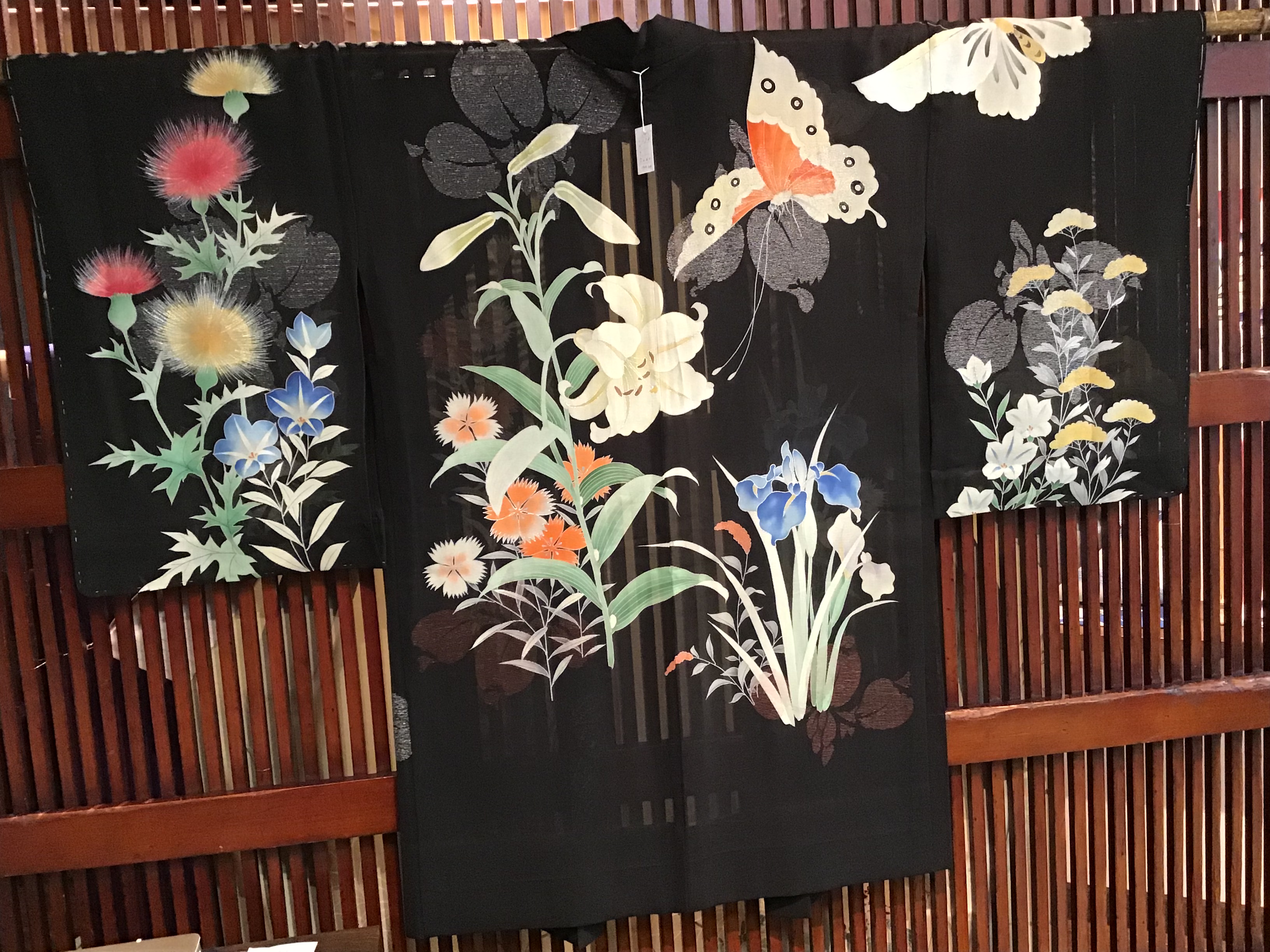 花に蝶黒地紗羽織   140,000円+税    裄  1尺7寸8分(約67、4㎝)    身丈2尺6寸(約98、5㎝)
