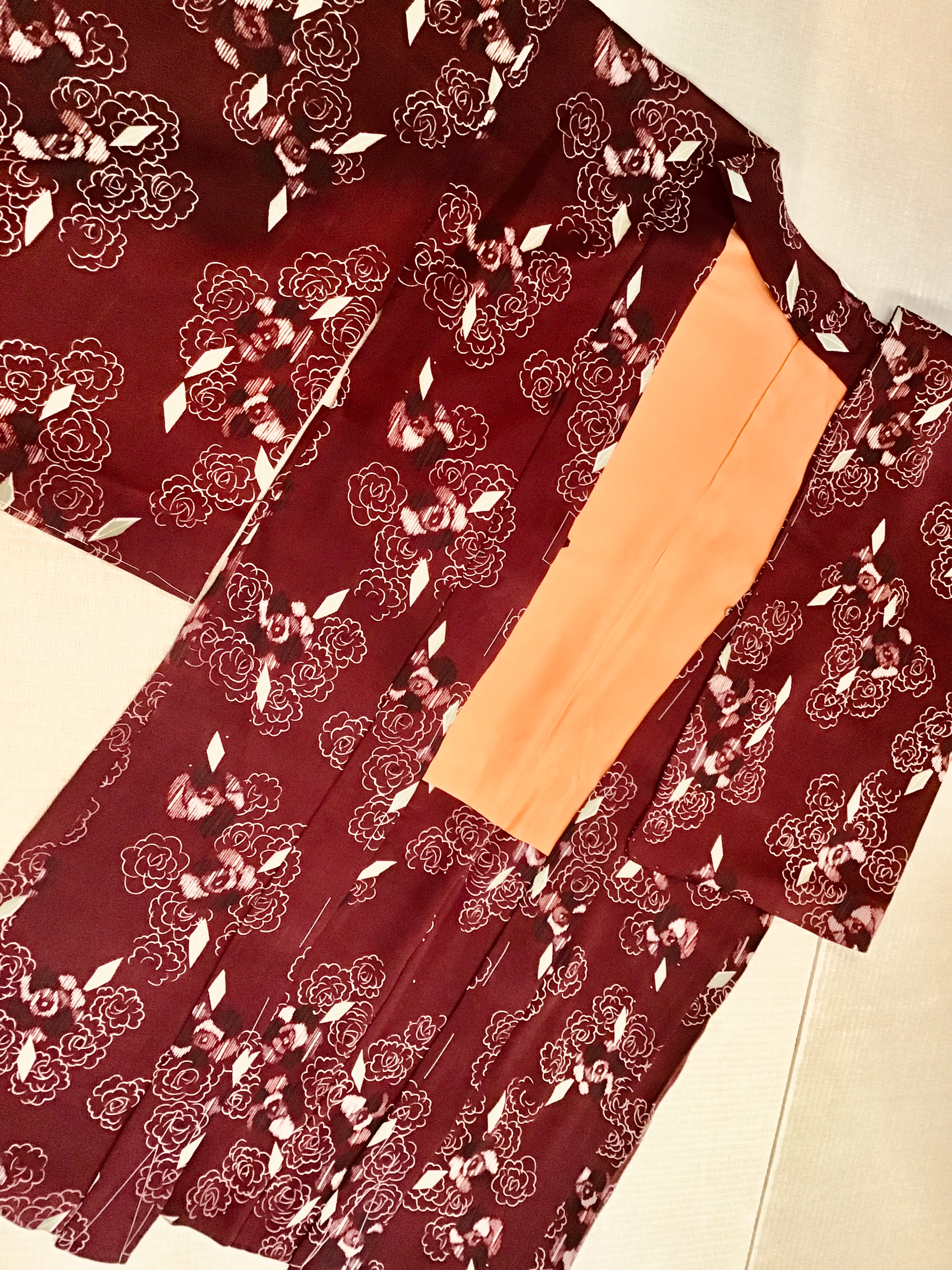 えんじ色アールデコ薔薇羽織(仕立て直し)70,000円+税 身丈2尺4寸5分(約92.8㎝) 裄1尺6寸8分(約63.6㎝)