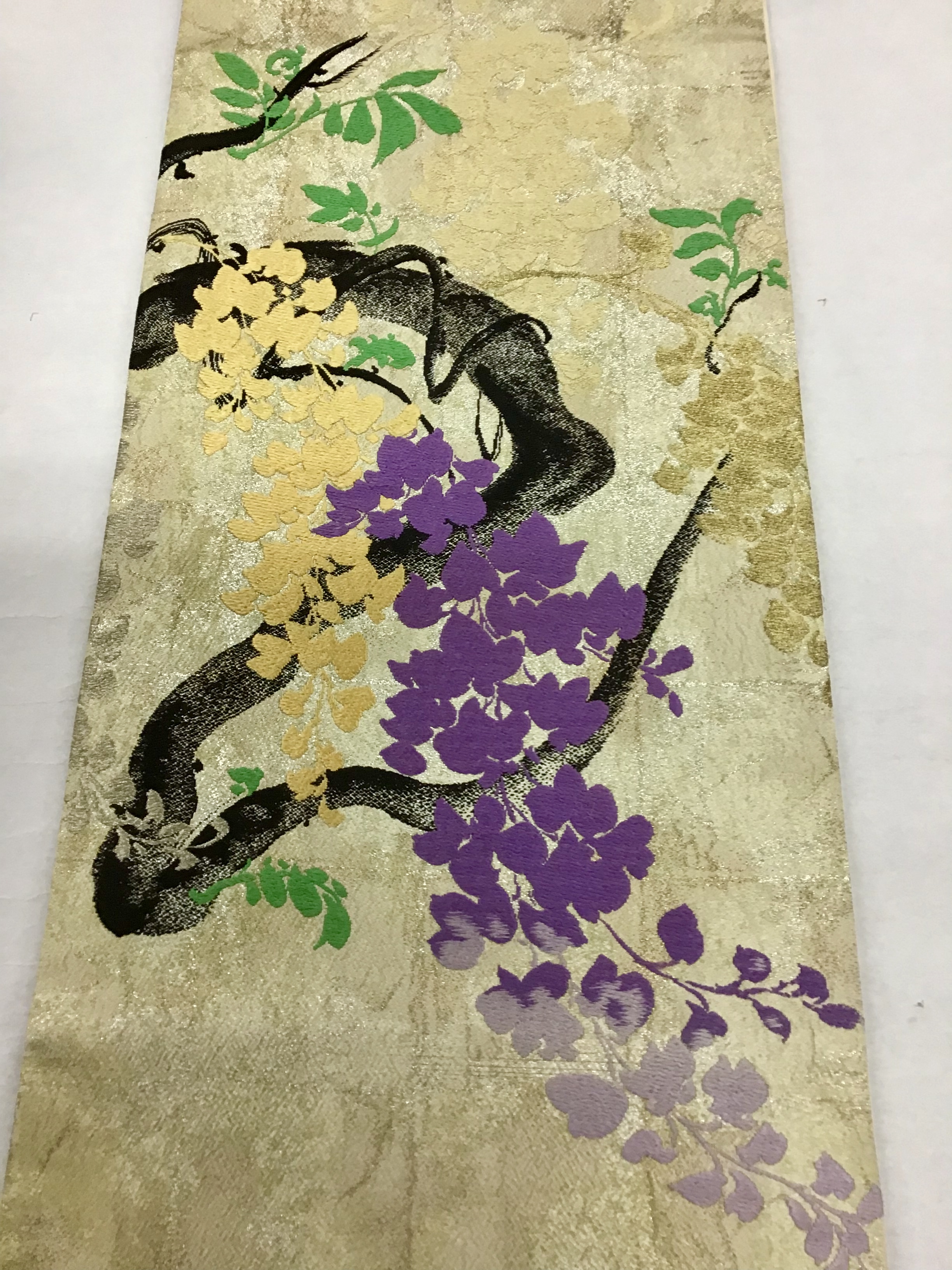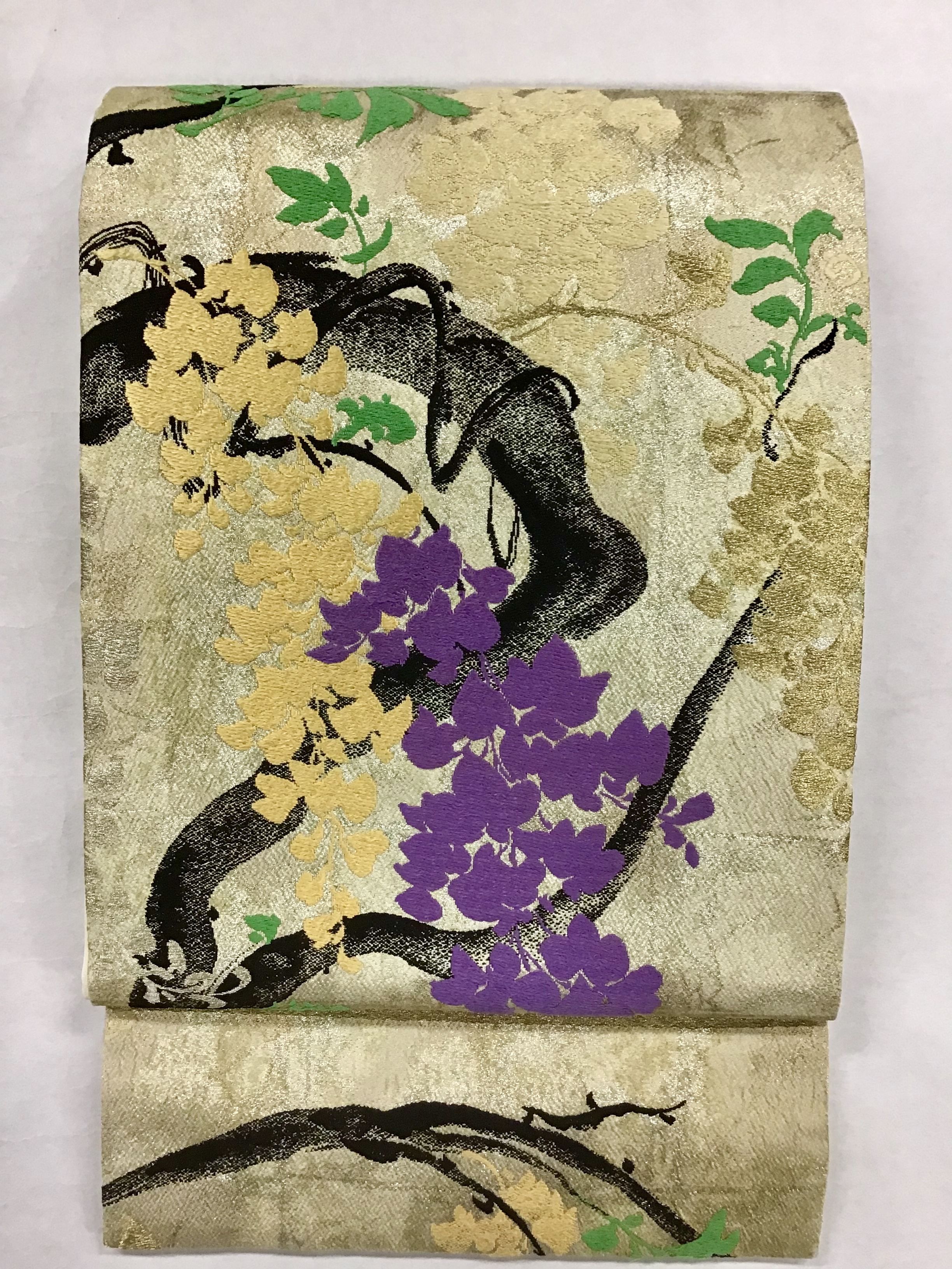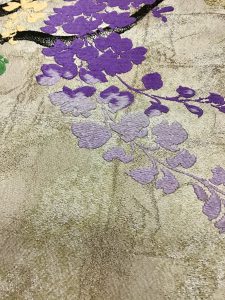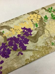 藤の花と言えば、妖艶で華やかなイメージが、ありますが、こちらの帯は、明るい引き染めの上にふっくらとした刺繍が、可愛い藤の花。