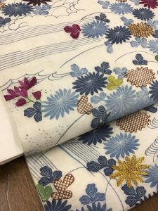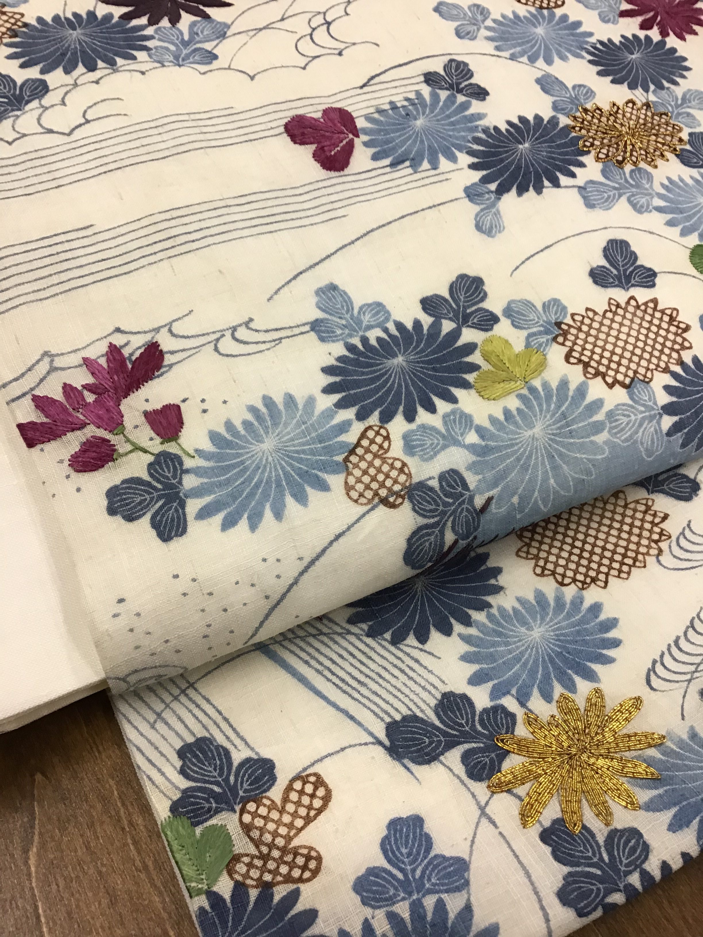 まずは、白地にすっきりとしたブルーの緻密な幾何学模様の越後上布。