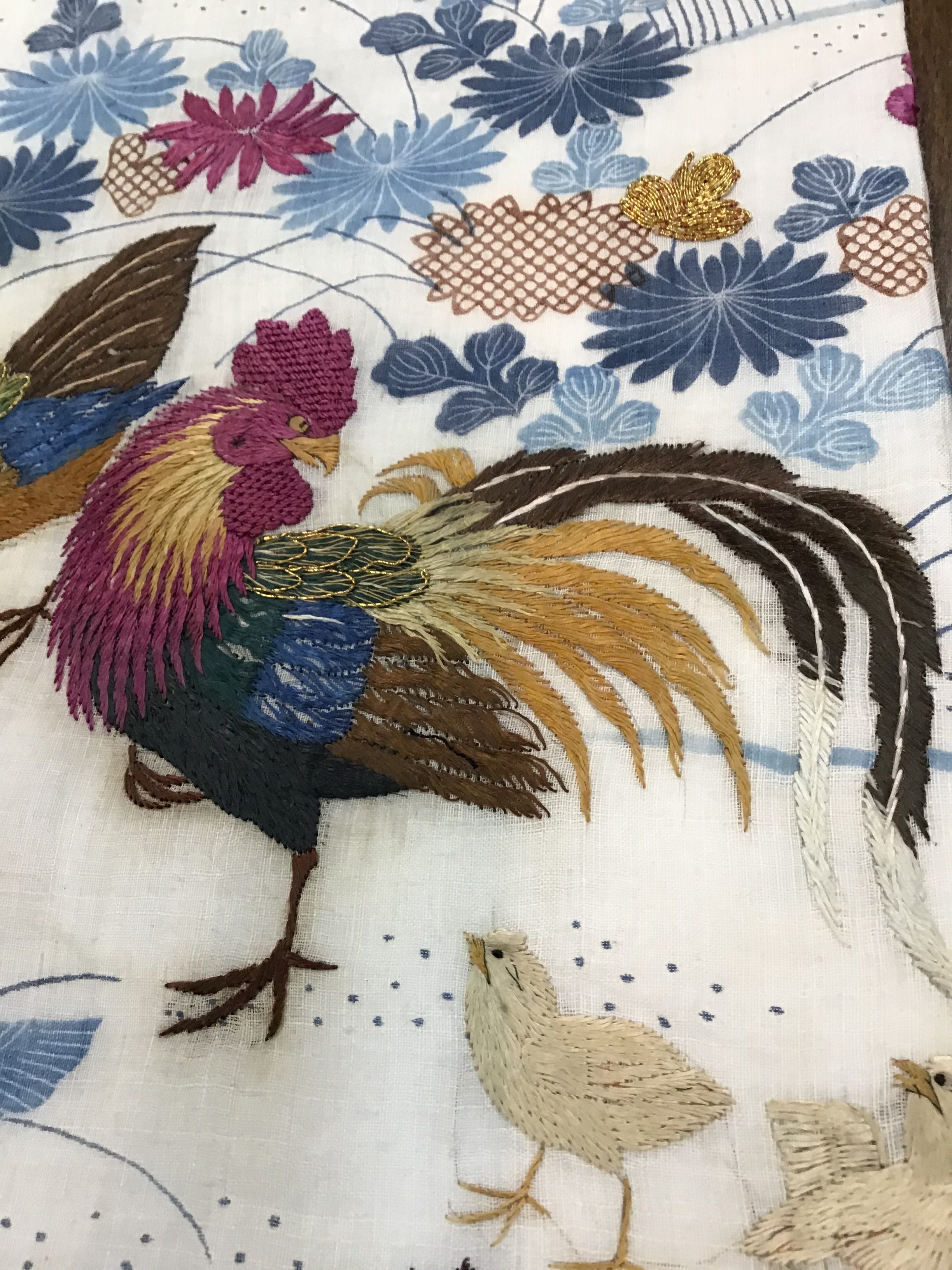 親子の鶏の会話が聞こえてきそうな可愛らしい刺繍