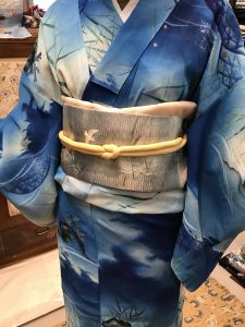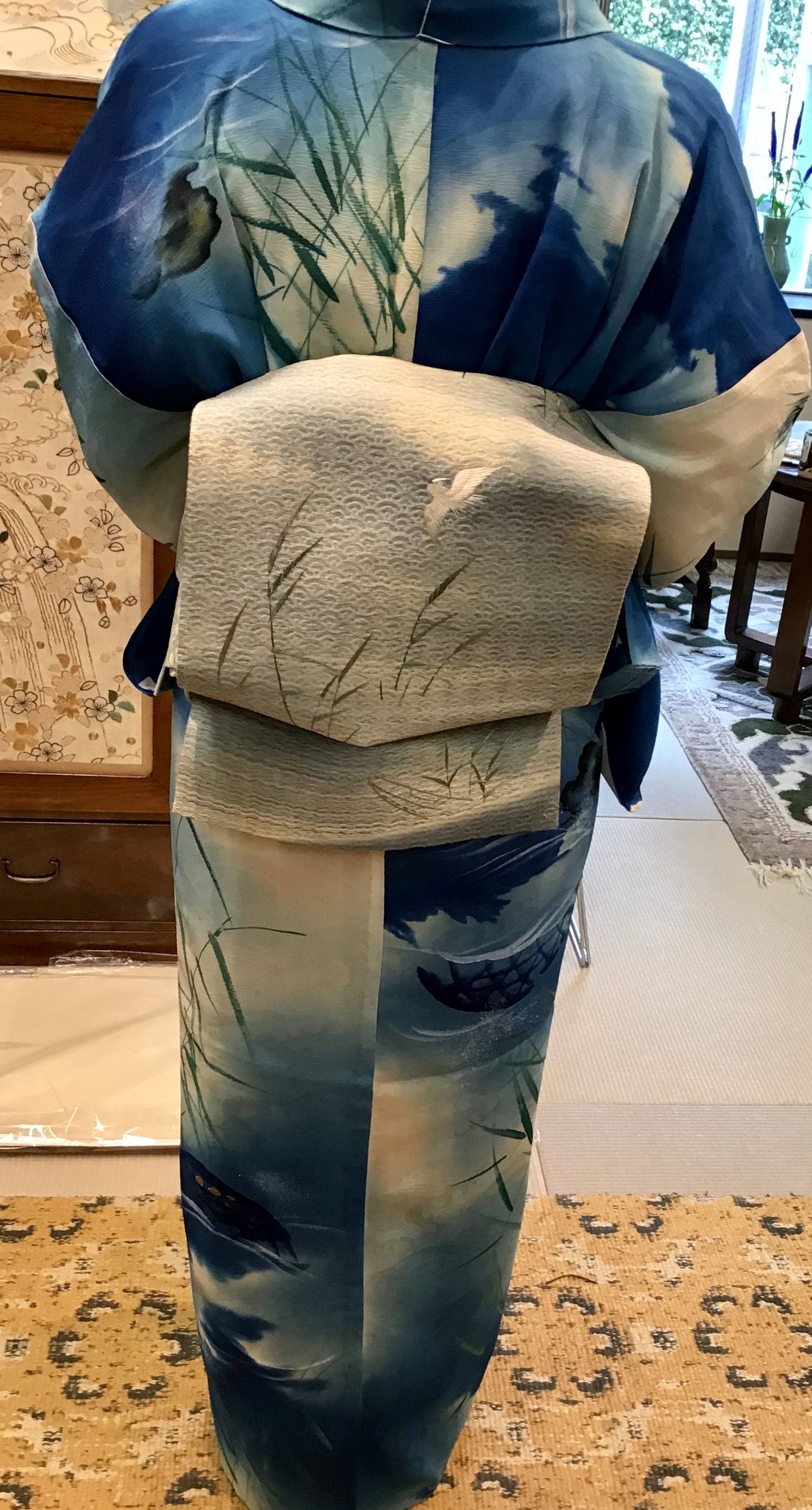合わせた帯は、生成りの地色に藍で表現した水辺でしょうか。