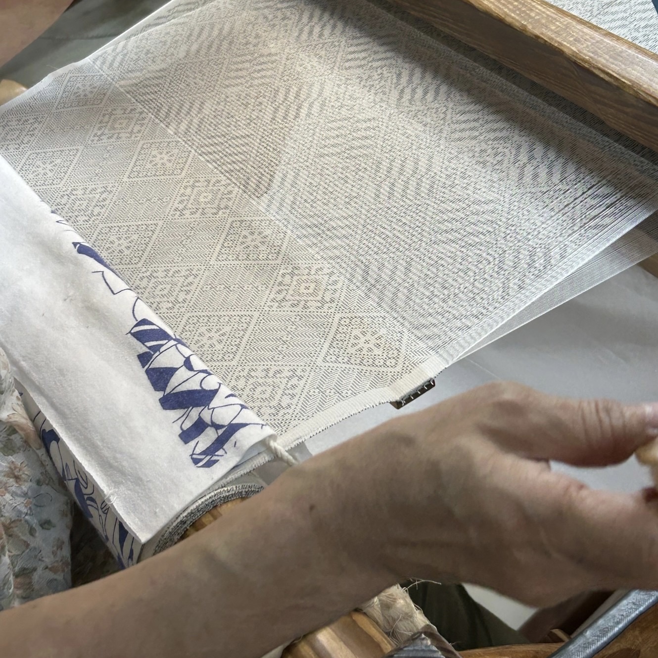 締機は、量産のために考案されましたが、依頼、絣の技術も格段に進化して、紬糸から生糸に変わることによって、より緻密に繊細になっていきました。