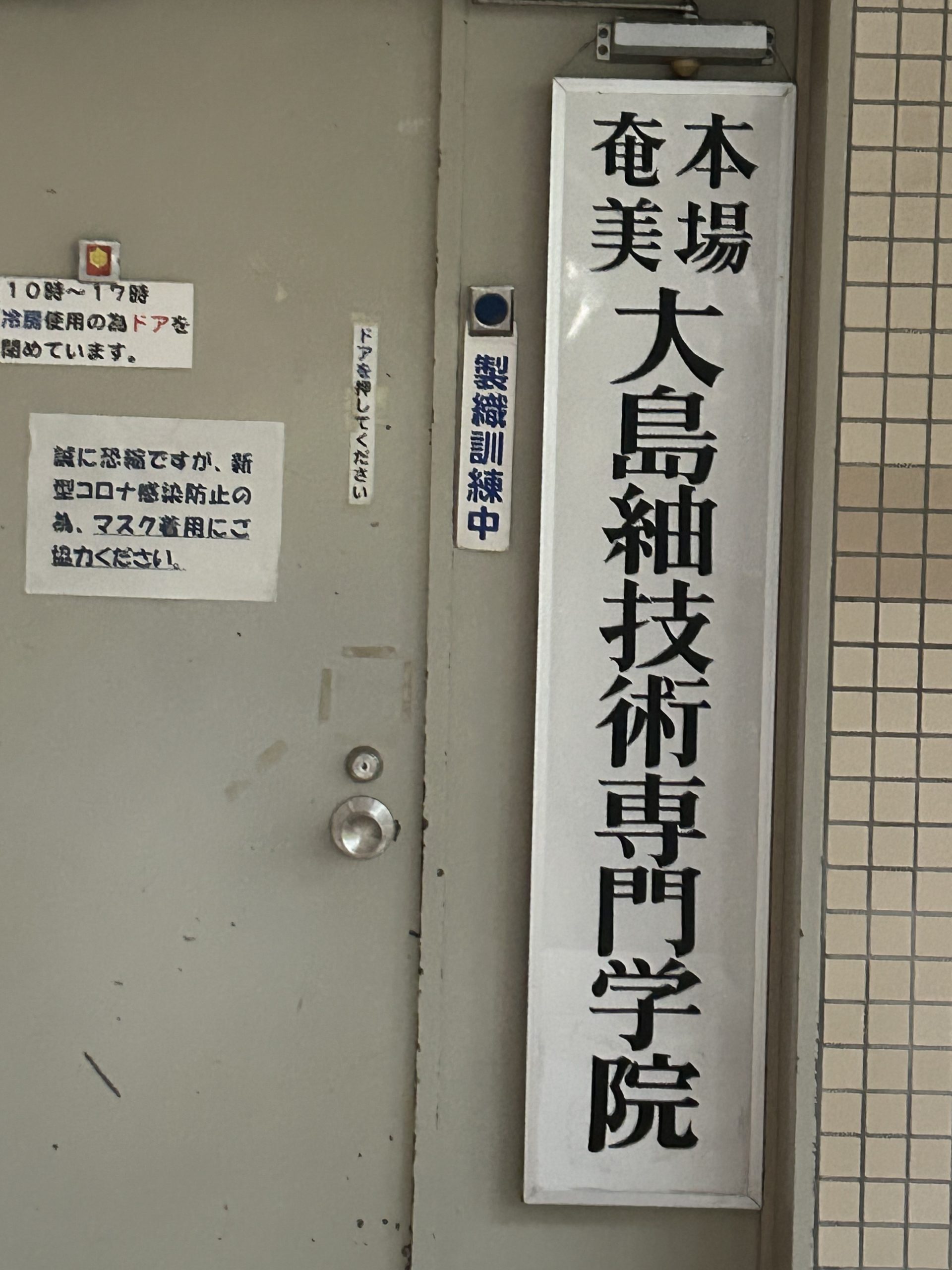 所でもう一つの理由は奄美の大島紬です。絣糸を作る締機をこの目で見て確認したかったのです。龍郷の町は、静かで落ち着いた緑のなかにありました。そこで、本場奄美大島紬技術専門学院を訪ねてみました。