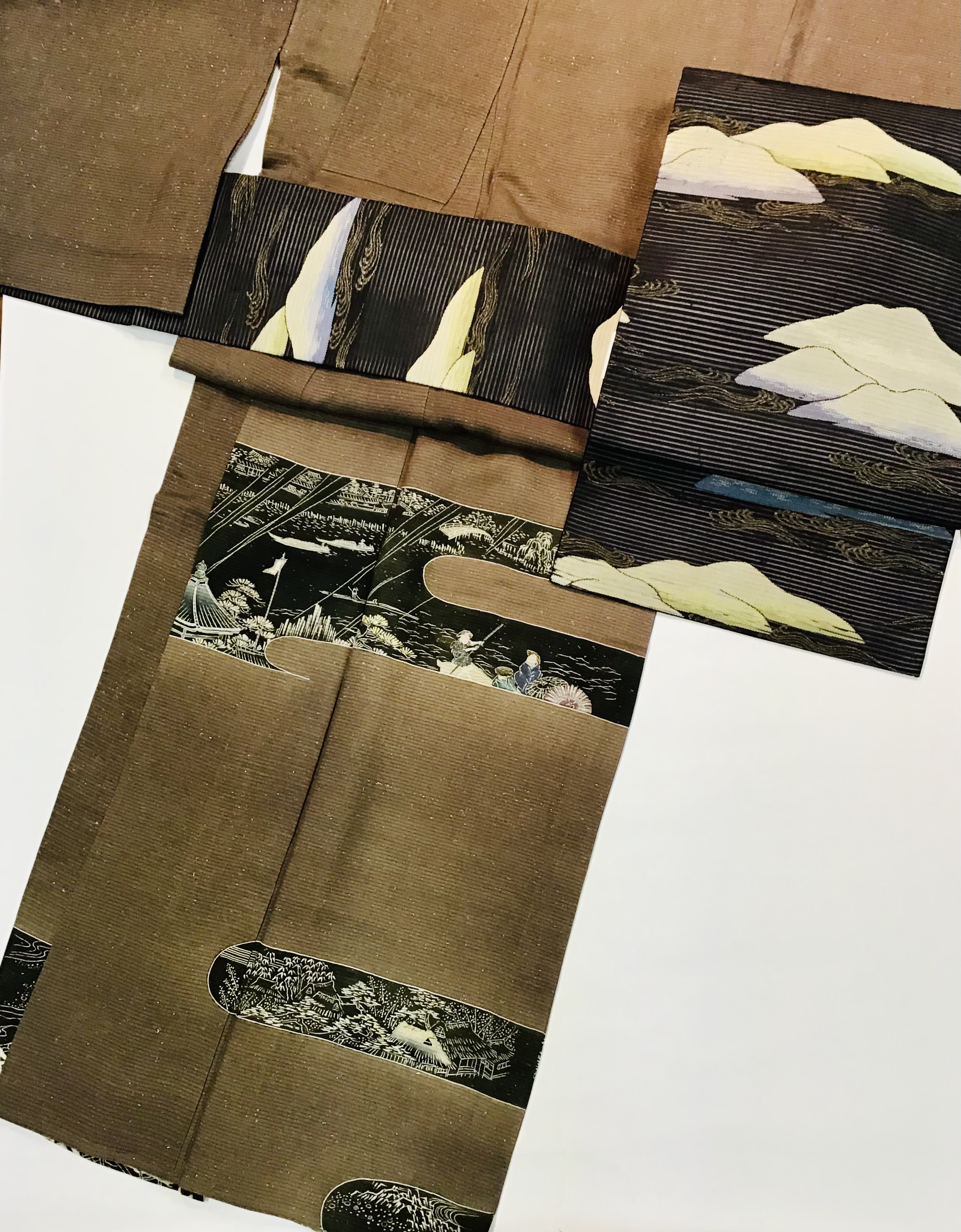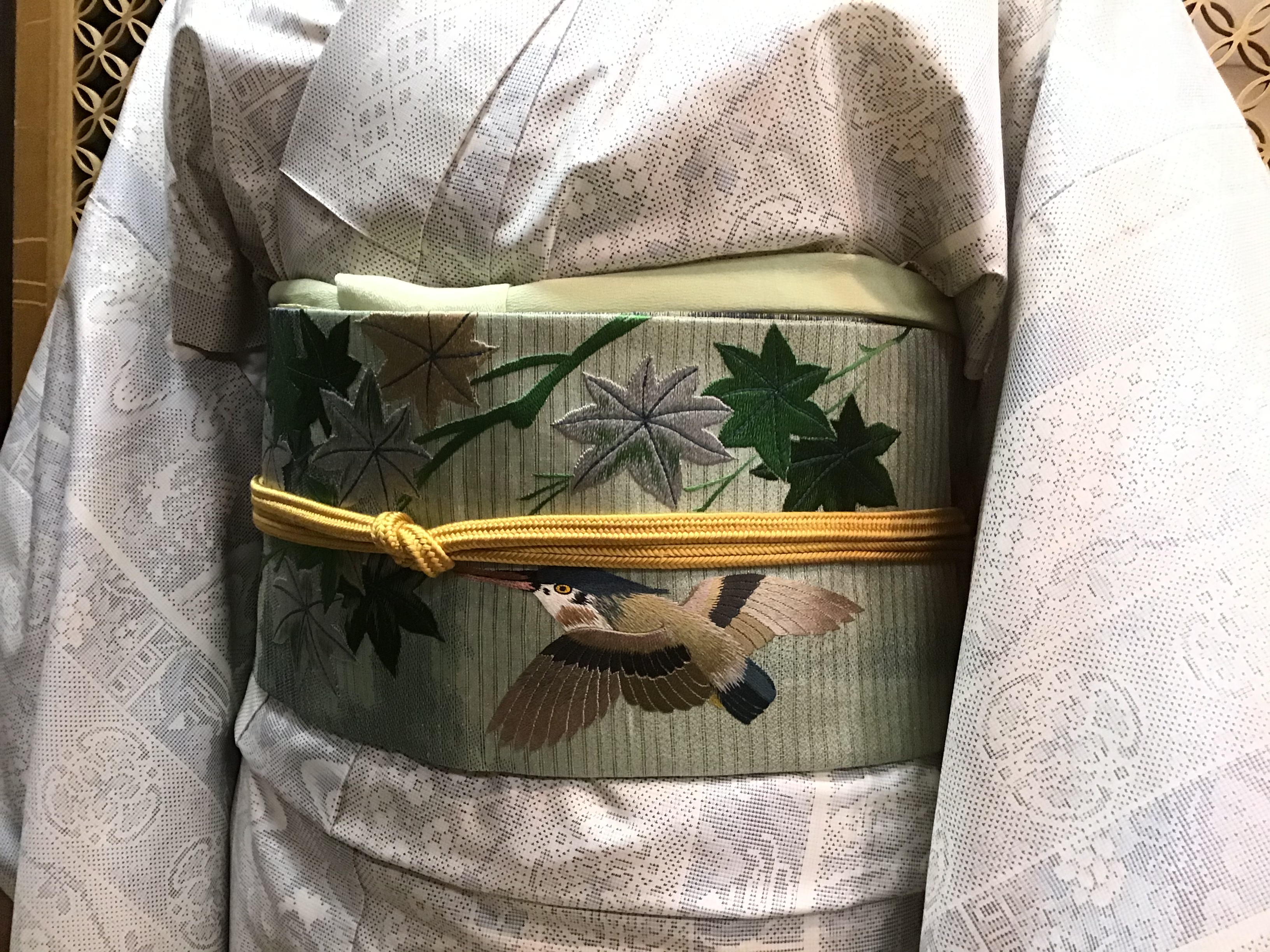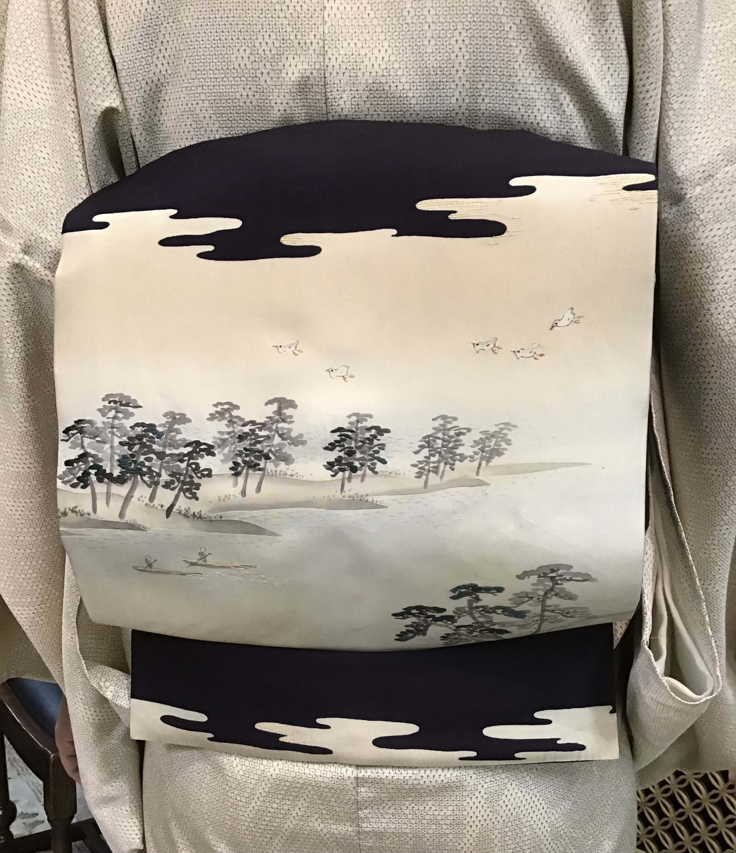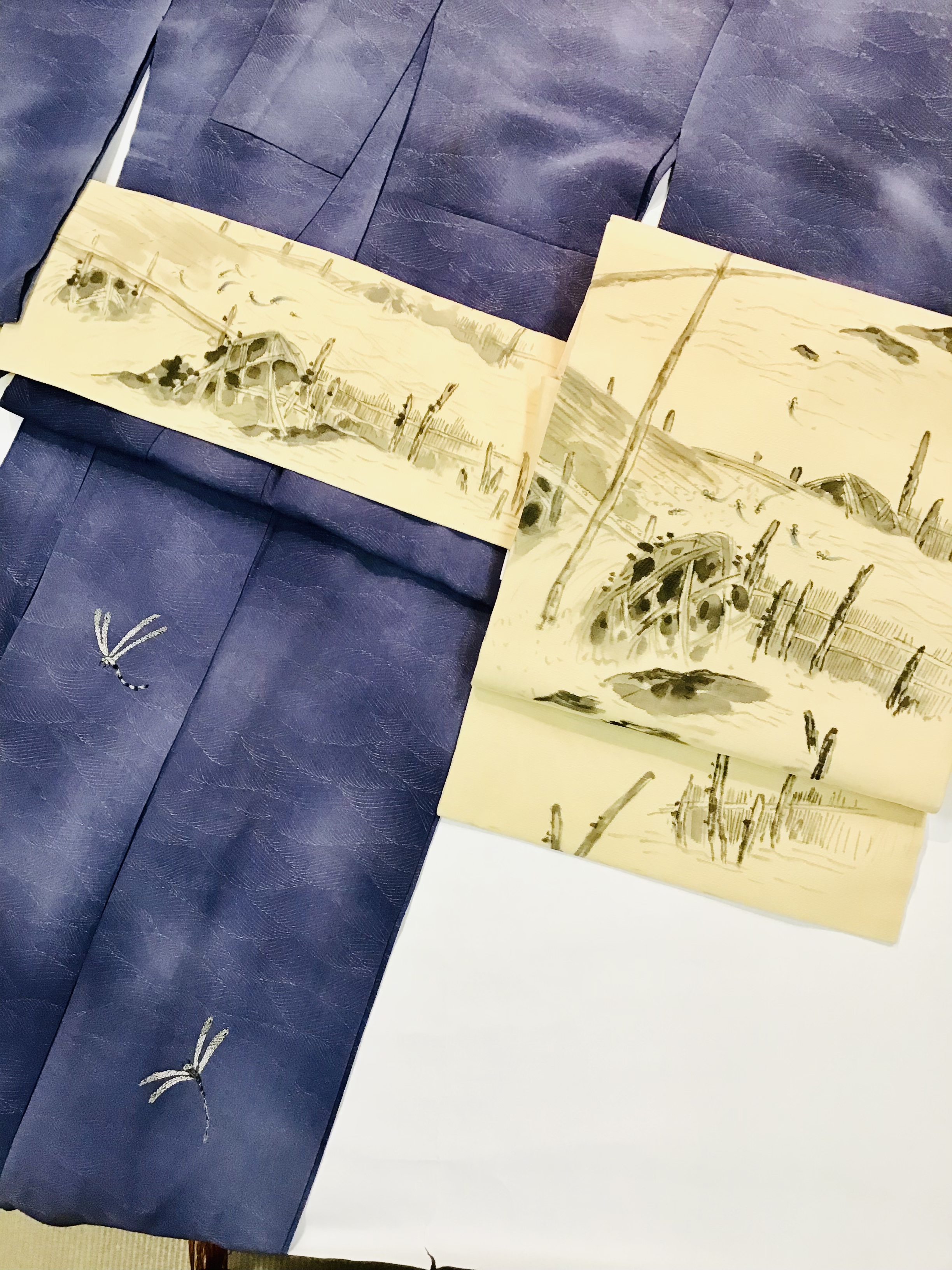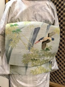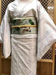 合わせやすい色の着物に、落ち着いた色柄の名古屋帯を合わせました。