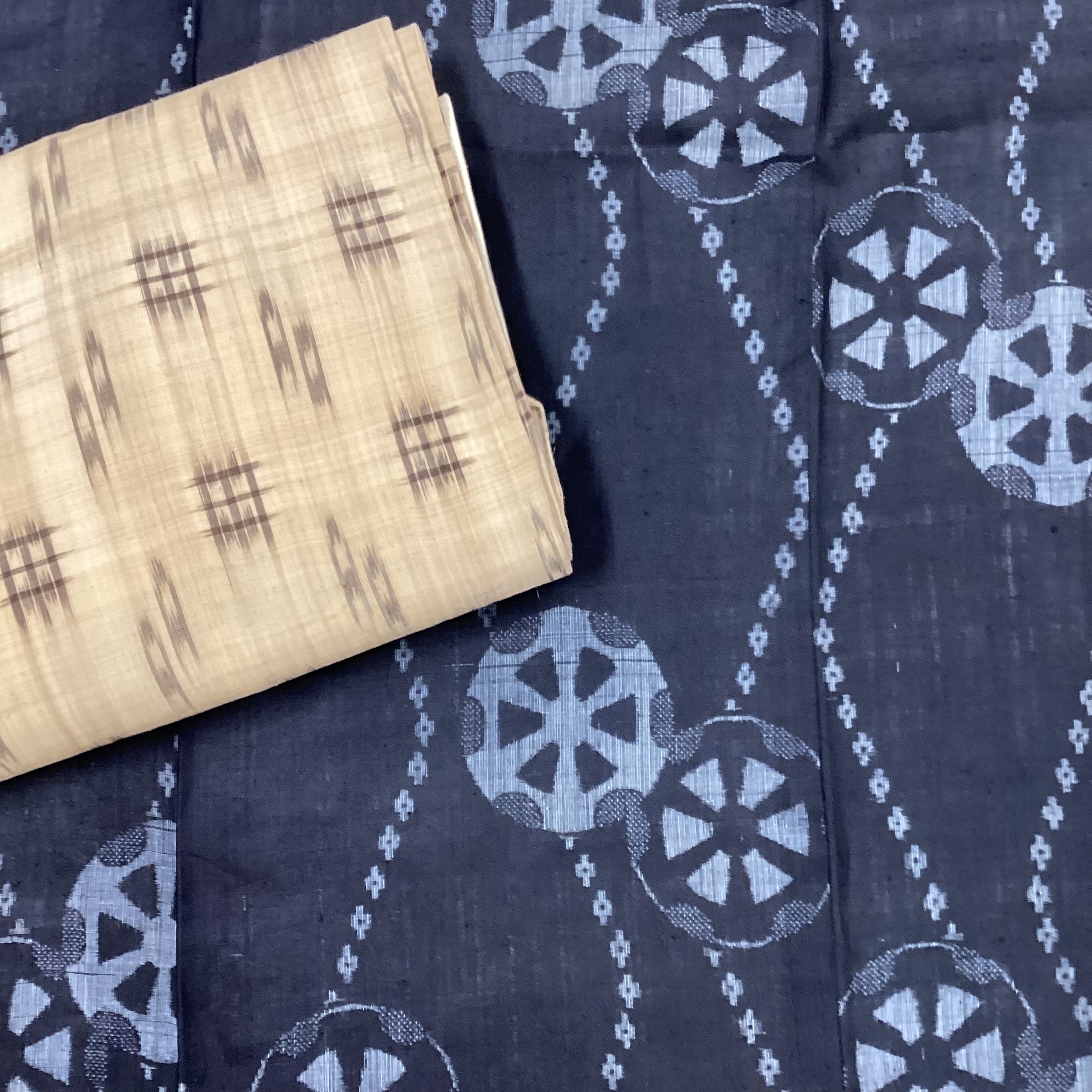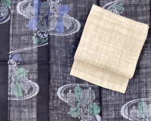 墨色に緑の蚊絣とからし色の横段が入った紬を合わせてみたら、ちょっと粋な感じになりました。